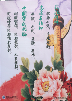 根据公司开展2014精神文明建设年度工作要求,我系结合中国画特色,设计了包含社会主义核心价值观、中国梦内涵、志愿精神、武汉精神等方面的内容的展板,张贴在系部显眼处、每个教画室、员工宿舍区,营造全体师生学习精神文明建设内容的良好氛围。