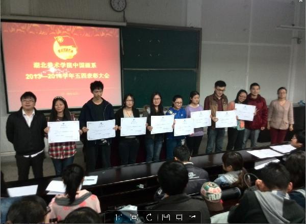 (通讯员 高晓宇)为纪念“五四”爱国主义运动95周年、中国共青团成立92周年,选树典型、表彰先进,进一步激发广大团员青年奋发进取精神, 2014年4月24日,中国画系在A12-106教室召开了2013-2014年度五四表彰大会。校团委负责人黄晓仑、系党总支负责人出席会议。系分团委书记刘杰,受表彰先进个人、受表彰集体代表、团员代表参加大会。会议由中国画系员工会主席主持。