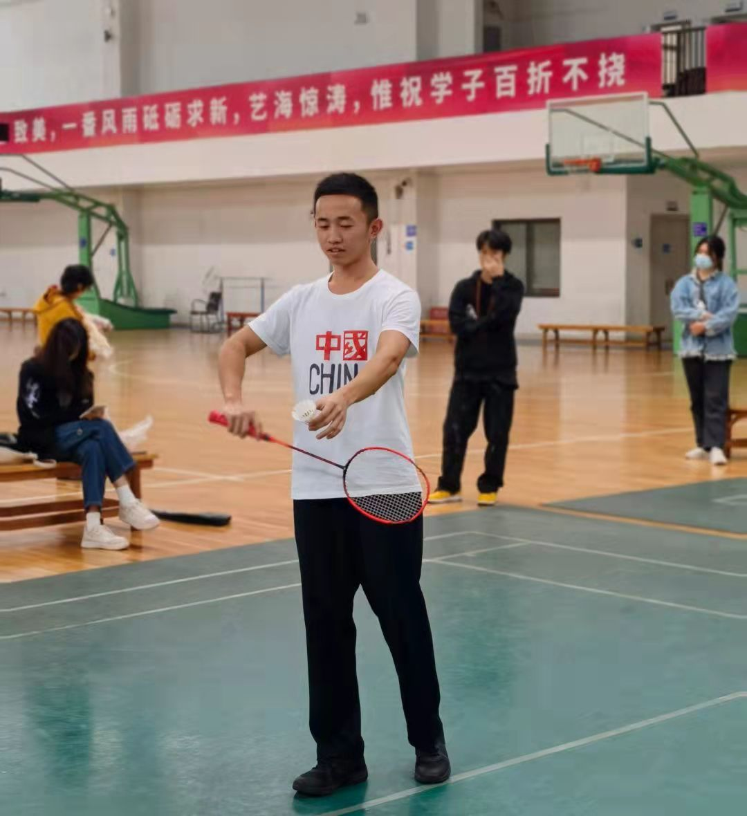 比赛前,参赛选手们认真热身,略带紧张,在观众们的热情欢呼喝彩中自信走向赛场。选手对战中,无论男单还是女单都藏龙卧虎,有上届羽毛球比赛冠军,沉着冷静;有优秀的退伍军人,奋力拼搏,有厉害的新生黑马,展现青春气息。