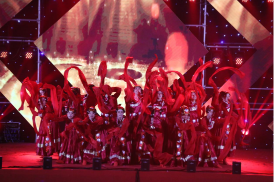 伴随着青春激昂的音乐节奏和璀璨耀眼的舞美灯光,公司舞蹈队的女生们红衣似火,激情奔放。忽而扬袖旋转,如同红莲初绽;忽而蹁跹萦绕,好似游龙摆尾。以饱满的情绪向党表心声,唱支山歌给党听,以极具民族魅力的藏舞表现形式和特征,用舞姿诠释对党的无限热爱。