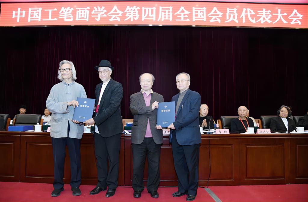中国工笔画学会会长陈孟昕(左二)为学术委员会委员李乃蔚等颁发荣誉证书(右一)