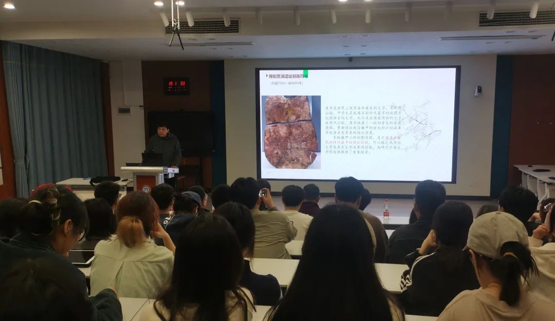 讲座开始,学术主持介绍了刘照剑教授的简历和学术成就。刘教授结合其精湛的学术研究和丰富的“国展”等文字审读经验,首先从汉字的意义、汉字的起源与中华文明的形成切题,并进一步说明了在古文字研究方面,特别是在文字应用方面应具有的态度和方法。