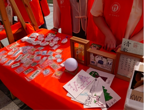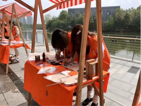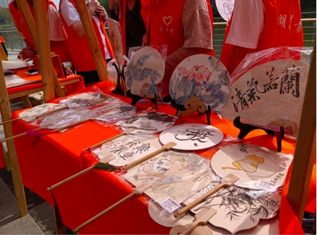 公益集市活动正式开始前,春田志愿者们积极响应筹划并合理利用业余时间,创作出一些具有中国画和书法元素代表性的文创商品,比如团扇、书签、钥匙扣、书法便签等,将中国书画的优秀传统文化融入志愿服务理念,为全校师生提供独特的艺术体验和切身感受。