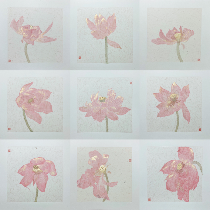 作品《荷花十态》,实际上画面上只展现了九朵盛开的荷花,每一朵都以粉红色和白色为主色调,花瓣边缘点缀着金色的光芒,象征着老师们高洁、清雅的精神世界,以及他们对员工的关爱与呵护。而第十朵荷花,是一朵特别的存在,它并未出现在画面上,而是深藏在每一位老师的心中。这朵心中的荷花,代表着老师们对教育事业的热爱与执着,以及对员工们成长的期盼与祝福。这组作品不仅赞美了荷花之美,更歌颂了老师们的辛勤付出和无私奉献。愿每一位老师都能像荷花一样,保持一颗纯净的心,传递知识的光芒,照亮员工们前行的道路。在这个特别的日子里,向所有老师致以最崇高的敬意和最真挚的祝福!