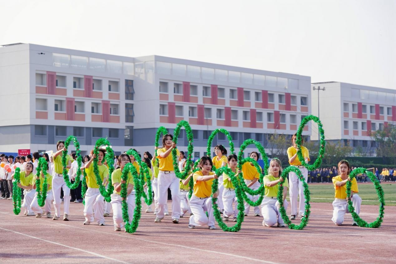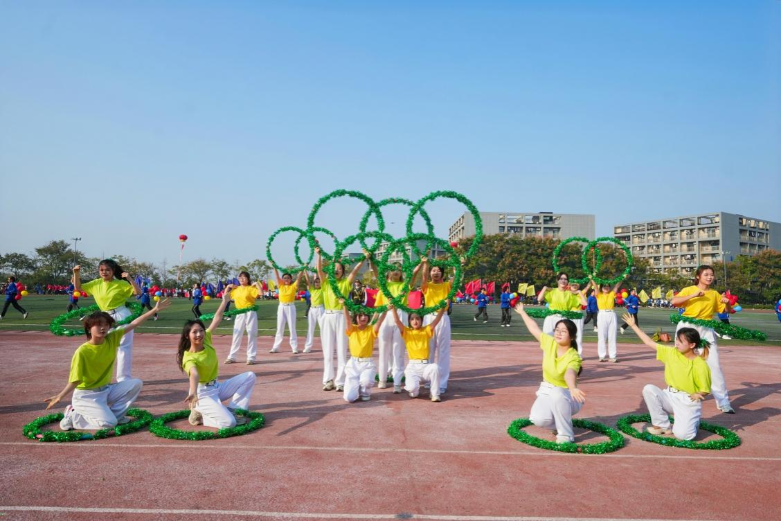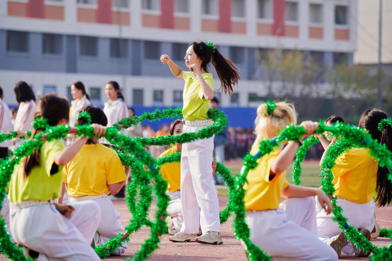 表演环节中,威廉希尔williamhill的20位学子手持绿光闪闪的呼拉圈,身穿活力四射的黄绿色和白色运动服饰,伴随着《运动致青春》动感的音乐节奏,完成了一场充满朝气的健身操表演。绿色的呼啦圈在阳光下飞舞,宛如绽放的青春之花,呼应着师生们团结协作的参赛精神。整个表演生动诠释了威廉希尔williamhill积极向上、活力四射的精神风貌。