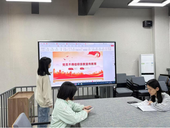 支部书记马老师组织开展党员不得信仰宗教专题教育。带领大家学习《关于新形势下党内政治生活的若干准则》、《中国共产党纪律处分条例》文件中关于党规党纪中不得信仰宗教的规定。参会党员结合自己的实际和思想感悟,围绕“党员为何不能信仰宗教”主题开展讨论交流。