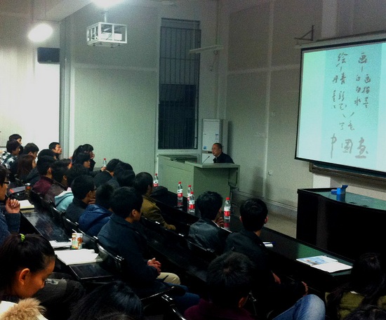 当晚,钟孺乾教授在A12教学楼104教室与师生面对面交流,作题为“中国画品鉴的审迹、味象和求境“的学术讲座。中国画系主任李峰对钟教授的到来表示欢迎,并简要介绍了钟教授生平与艺术造诣。