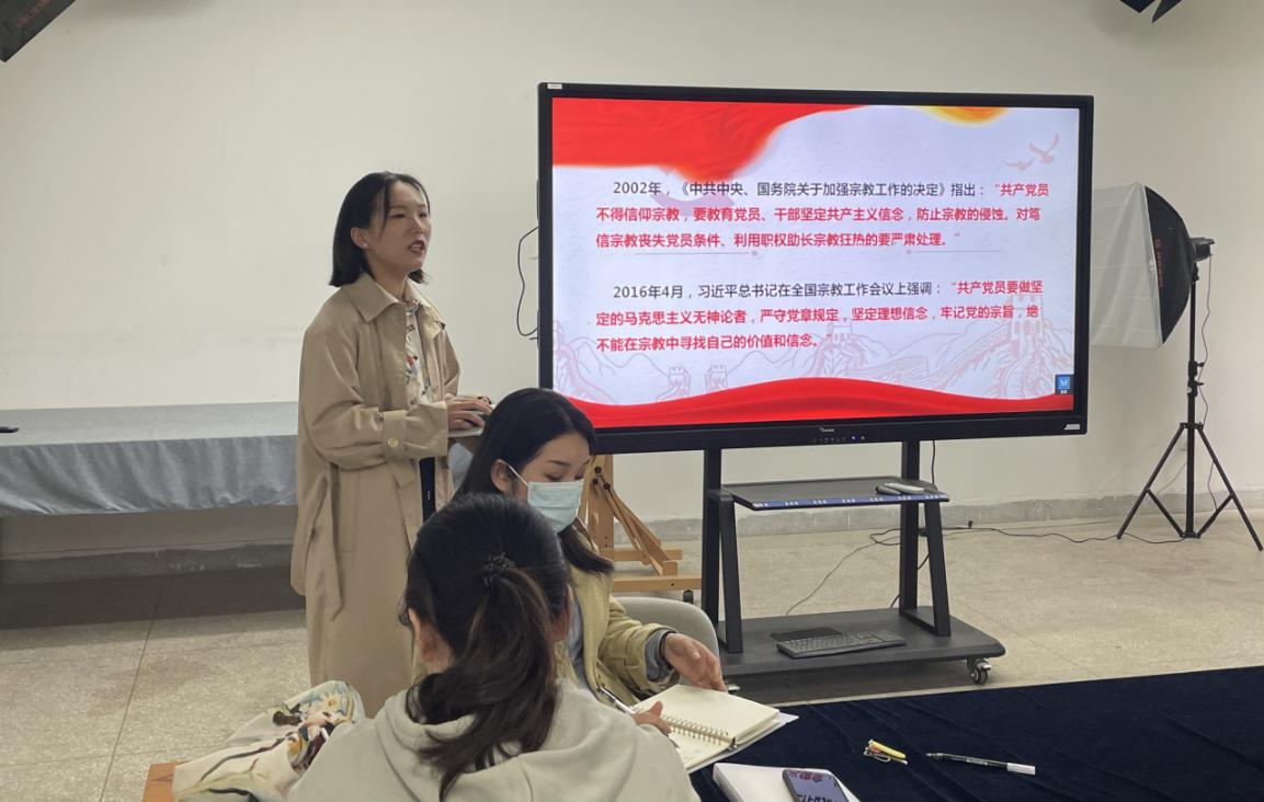 首先,由组织委员周沫同学带领大家学习党员不得信仰宗教的专题教育,与会党员讨论。其中,侯登云同志发言到:“通过今天的学习让我深刻意识到我们身为共产党员,都应该是无神论者,绝不能在宗教中寻找自己的价值和信念。”