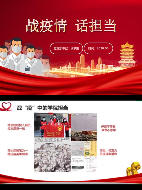 以“迎党的生日、讲战疫故事、悟初心使命”为主要内容,党员同志用不同形式分享自己心中的战疫精神,形成了独具党支部特色的“战疫故事汇”。在这场全民皆战的战疫中,是广大医务工作者舍生忘死,冲锋陷阵在疫情最前线,是广大服务志愿者的无私奉献,使疫情得到控制,他们用大爱铸就担当。岁月静好,是因为有人在为我们负重前行。