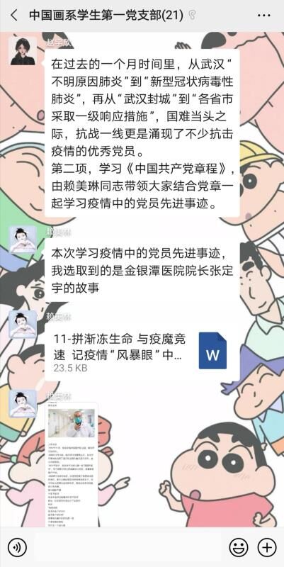 中国画系员工第一党支部开展线上支部主题党日活动由组织委员赵宇欣同志主持会议。首先,刘巧同志带领大家学习“习近平总书记在中央政治局常务委员会会议研究应对新型冠状病毒肺炎疫情工作时的讲话,在统筹推进新冠肺炎疫情防控和经济社会发展工作部署会议上的讲话”、湖北省委书记应勇2月27日在省委常委会会议上有关《清醒把握形式、毫不放松防控指导疫情防控重要讲话精神》、《习近平总书记在十九届中央纪委四次全会上的重要讲话精神》、《中共湖北省第十一届纪律检查委员会四次全会精神》及《中共湖北省委 湖北省人民政府 关于全力以赴坚决打赢我省新冠肺炎疫情防控阻击战的意见》。通过学习文件,各位党员在充分领会文件精神的前提下,纷纷发表自己的见解与感悟。其中,张以宁同志认为应积极响应国家号召,坚定信心、同舟共济、科学防治、精准施策,并遵守地区发布的防疫规定,积极抗疫。