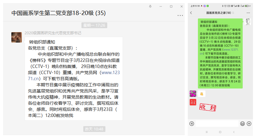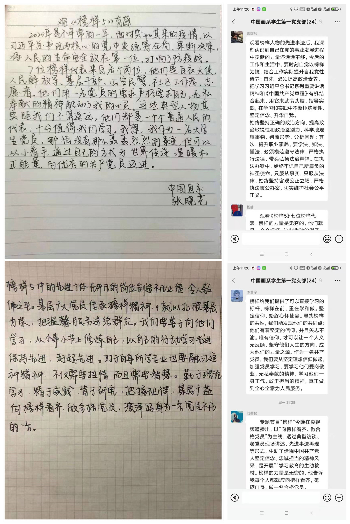 为深入推进“不忘初心、牢记使命”主题教育开展,弘扬榜样精神,致敬抗疫英模,3月22日,中国画系党总支采取自行学习、集中讨论的方式组织全体教职工党员、员工党员学习观看《榜样5》专题节目。