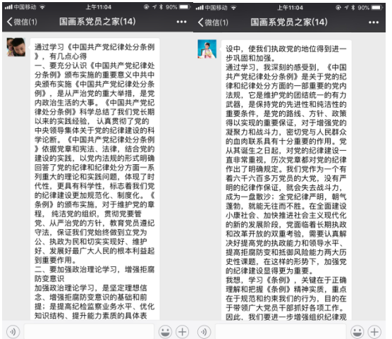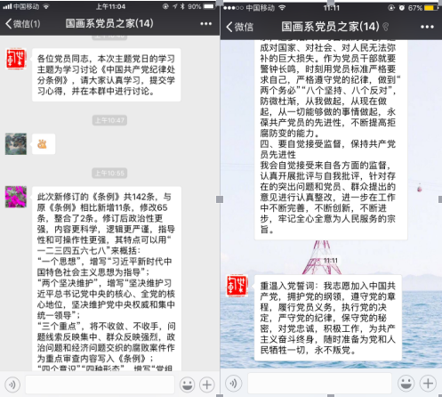 按照公司相关要求,中国画系教师党支部于9月20日在支部微信群中开展了支部主题党日活动,重温入党誓词,并就新修订的《中国共产党纪律处分条例》具体内容展开学习与讨论,全体教师党员参加学习,活动由中国画系党总支书记曹汉萍主持。