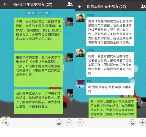 11月25日下午,中国画系本科生党支部全体成员在中国画本科生党员讨论组里展开了微信学习讨论会议,党员们围绕“讲奉献,有作为”这一主题展开了热烈的讨论。在会议上,大家学习了《中国共产党章程》、《关于新形势下党内政治生活的若干准则》、《中国共产党党内监督条例》以及《全省“两学一做”学习教育工作暨落实基层党建重点任务推进会》上的系列讲话精神,会议由本科生党支部副书记李佳津同志主持。