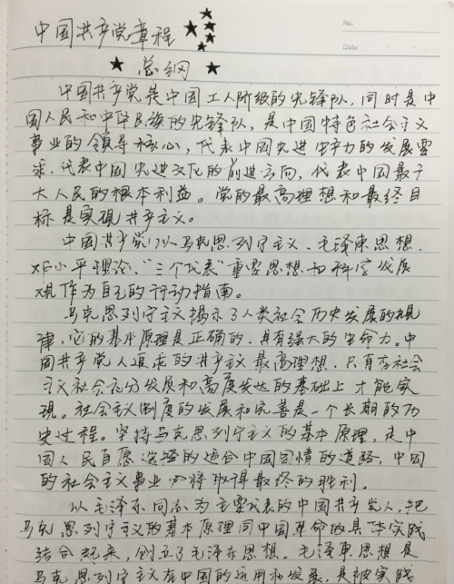 党章是党员的第一课、必修课。党章刻画了合格党员的标准,明确了党员的权利和义务,既为我们履行职能使命、发挥党员作用提供了遵循,也为评判党性“纯度”、丈量品德“高度”提供了度量和标尺。抄写党章、学习党章,让每一个党员在学习中深刻领悟,才会真正树立起对党章的尊崇之心,才会在行动中产生遵守党章的自觉动力。我系将此次“手抄党章”特色活动作为“两学一做”学习教育的重要内容,要求员工党员学好党章、抄好党章,时刻提醒每一名党员都要清楚自己的定位,既是普通群众中的一员,又是光荣的共产党员,牢记共产党员的职责使命。