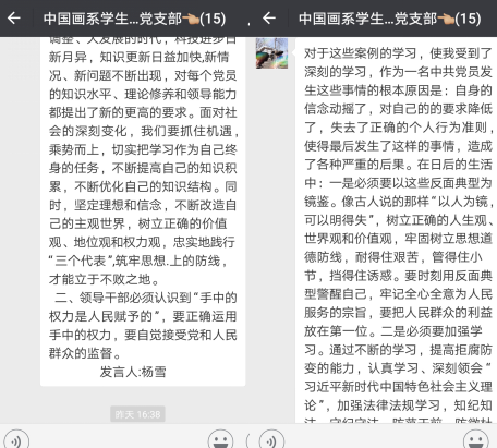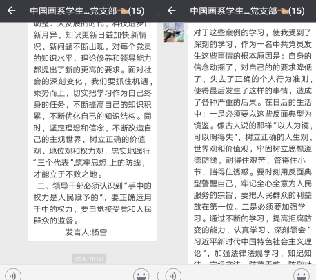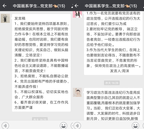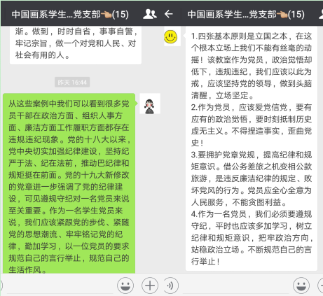 (通讯员:汪偲慧)党的十九大新修改的党章进一步强调了党的纪律建设,为贯彻落实党的要求,提高青年党员的组织性、纪律性,5月25日16:00点,中国画系员工第一党支部组织了一次以微信群聊方式进行的支部学习。会议由员工第一党支部书记刘杰主持。