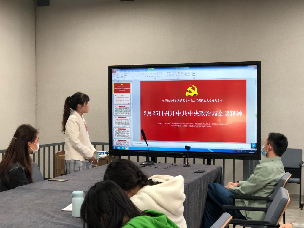 为了更好的传达最新的理论知识,由黄凯帆、冯谦、梅安琪、彭晨同志带领大家分别学习习近平总书记在中央党校中青年干部培训班开班仪式上发表重要讲话、《求是》杂志发表习近平总书记重要文章《在中央人大会议上的讲话》《坚持走中国特色社会主义法治道路,更好推进中国社会主义法治体系建设》、2月25日召开的中共中央政治局会议精神和习近平总书记在中共中央政治局第37次集体学习讲话。