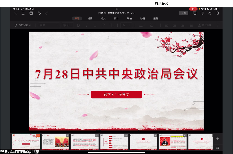 吴依宸、彭晨、程思雯同志分别带领大家学习了《求是》杂志发表习近平总书记重要讲话《更好把握和运用党的百年奋斗历史经验》、习近平总书记在中央统战工作会议上的重要讲话精神、7月28日中共中央政治局会议精神等学习内容。
