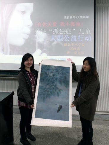 3月30日晚7时,画作捐赠仪式于公司A12栋105教室举行,中国画系研一党支部全体成员与大楚网新闻部工作人员进行了详细交流,并观看了自闭症儿童相关资料。网络义拍活动于4月期间在腾讯微博展开,据悉,中国画系研一党支部捐赠的画作,帮助此次活动筹集善款达4240元。活动筹得善款将全部用于自闭症儿童的医药费和生活费。