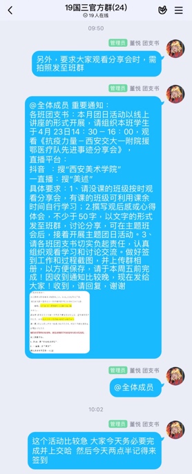 为了引导同学们积极助力打赢此次疫情战役,推动健康学习和生活。4月23日,我系以五四主题团课学习的形式,动员组织广大团员青年观看由西安美术公司团委主办的西安交大一附院援鄂医疗队先进事迹分享会。全系党员干部和员工通过线上观看直播的方式,聆听了西安交大一附院石秦东教授和梁晨博士两位援鄂抗疫英雄的先进事迹,学习他们无私无畏的奉献精神。