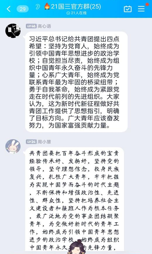 本次专题学习会由各班团支书主持,重点学习了4月25日习近平总书记在中国人民大学考察时的重要讲话精神,5月10日习近平总书记在庆祝中国共产主义青年团成立100周年大会上的重要讲话精神。