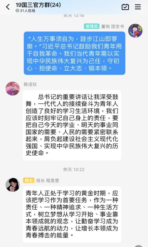 20级国画三班徐梁斌:习近平总书记在庆祝中国共产主义青年团成立一百周年大会上对我们提出要求:做青年友,不做青年官,多为青年计,不为自己谋,去担苦,担难,担重,担险,老老实实做人,踏踏实实做事,心有所畏,言有所戒,行有所止,做一个一心为公,一身正气,一尘不染的人!这对我有很大的启示和警戒作用,作为青年员工干部,我们应该真正明白自己所做工作的意义和目的,是服务同学,而不是为自己搭桥铺路。要切实明白我们的责任和担当,不忘初心,始终坚持原则底线,真正做青年朋友的勤务员。