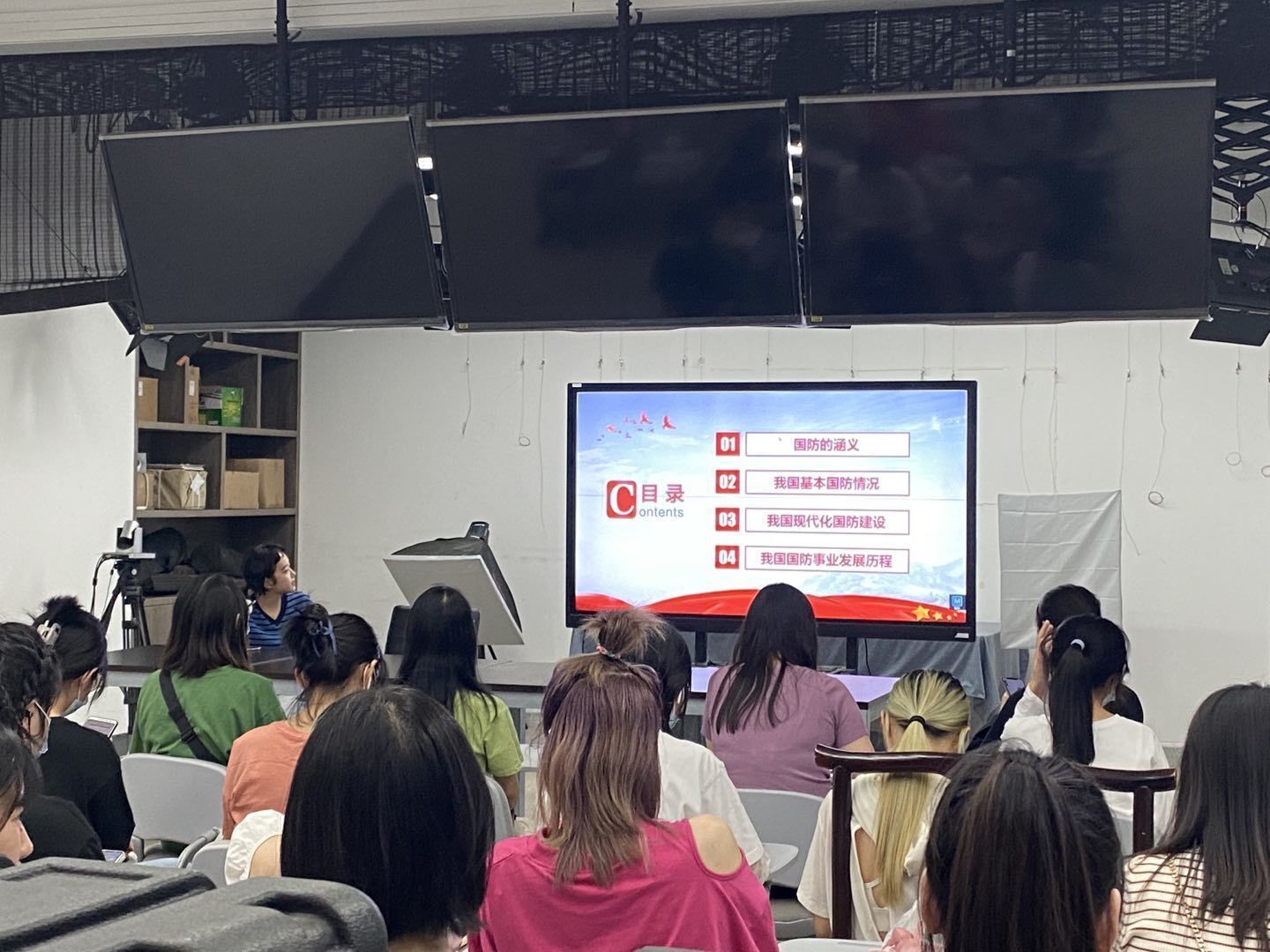 各班班长分别从国家与国防、战争与和平、国防建设与经济建设、和平与发展、国家防卫的方针战略等方面向大家讲解了有关国防的理论知识,并围绕“如何国防”这个话题详细讲述了国防历史。各班团支书也向同学们分享了关于老一辈革命英雄的红色故事,同学们被革命者的精神所感动,表示要更加努力学习,抓住机遇,为中华民族的伟大复兴而奋斗!