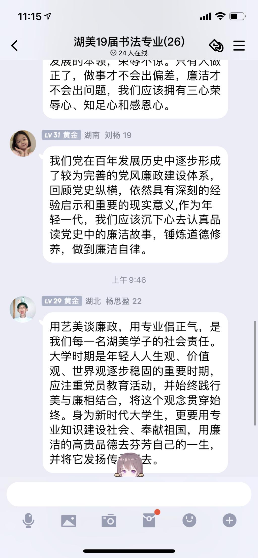 为加强落实中共中央国务院关于老员工的思想道德教育工作,把廉政文化教育和校园文化活动结合起来,培养员工廉洁品质,2021年9月19日—24日威廉希尔williamhill辅导员曾艳老师特组织各年级员工开展“清廉湖美大家谈”线上主题班会活动。
