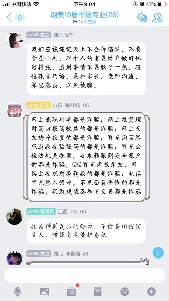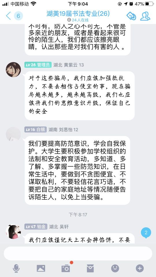 随着社会的发展,信息技术的进步,电信诈骗现象越来越常见。为了响应公司号召,提高新生安全防范意识,杜绝电信诈骗情况的发生,10月4日至9日,中国画系辅导员曾艳老师、涂梦娟老师围绕“校园反电诈反”主题,组织中国画系本科生召开线上或线下班会。班会由各班班长负责主持,团支书负责考勤记录。