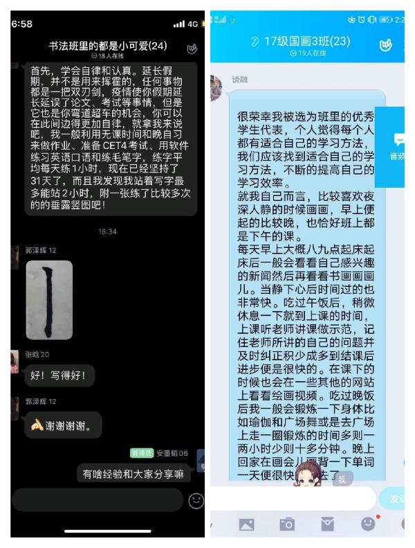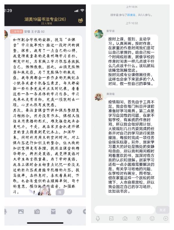 通过邀请班上优秀的同学分享自己在疫情期间的学习经验、专业课习作以及学习笔记,以此调动大学学习的积极性,启发他们刻苦学习、努力向上,从而形成良好的线上学风,引导他们真正实现“宅在家”向“学在家”的转变.