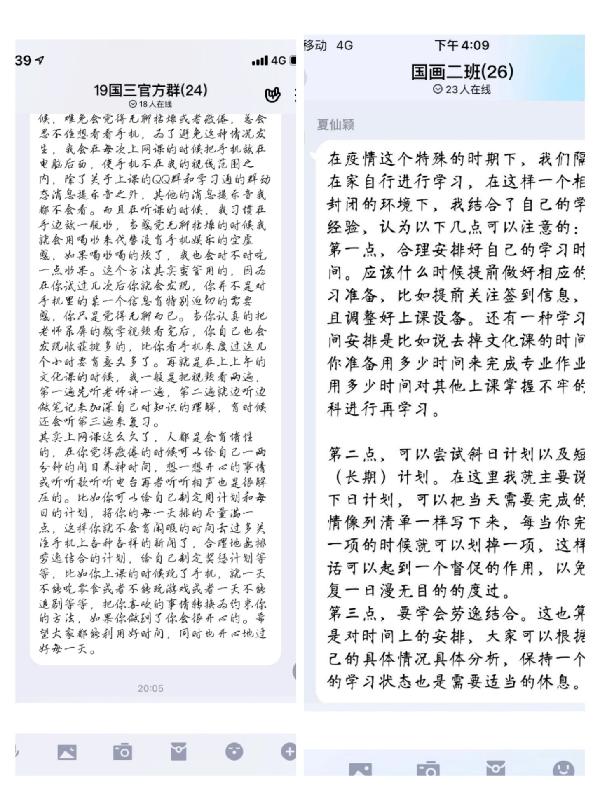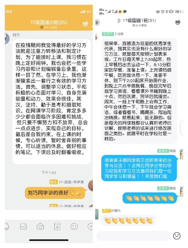 疫情期间,公司按照“停课不停教,停课不停学”原则,搭建网络平台,使每一位员工能够宅家上网课。为建设良好的线上学风,引导员工养成良好的线上学习习惯,掌握科学的线上学习方法,促进学习积极性。5月20日至23日,中国画系本科生辅导员曾艳老师和涂梦娟老师组织各年级员工召开“树榜样,建学风”线上主题班会,由各班班长、团支书利用班级QQ群、微信群、QQ群课堂等网络平台主持召开。