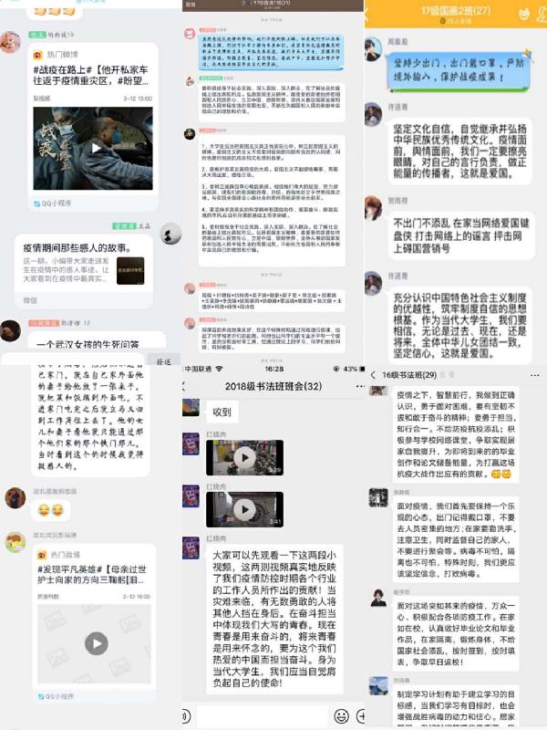 抗击疫情,思想稳定是关键,为引导员工提高政治站位,增强责任意识和防护意识,激发员工爱国情怀,树立正确的人生观、价值观,以实际行动报效祖国,2020年3月10日至12日,中国画系本科生辅导员曾艳和涂梦娟老师组织各年级员工召开“共同抗疫,爱国力行“线上主题班会。