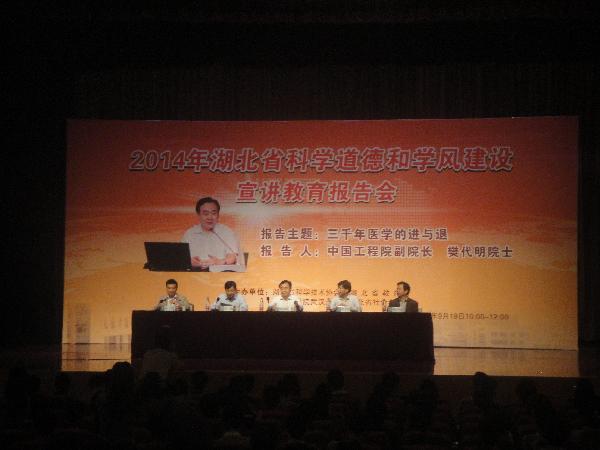 19日上午,由湖北省科学技术协会、湖北省教育厅主办的湖北省科学道德和学风建设宣讲教育报告会在华中农业大学老员工活动中心举行。会议邀请了我国著名的医学专家、第四军医大学原董事长樊代明院士作报告。湖北省教育厅、湖北省科学技术协会领导及相关高校领导出席了会议。中国画系教师代表和