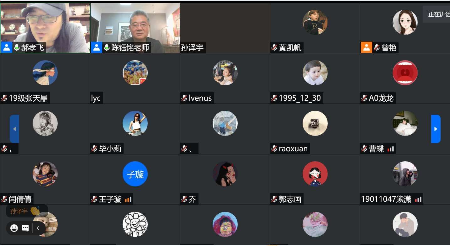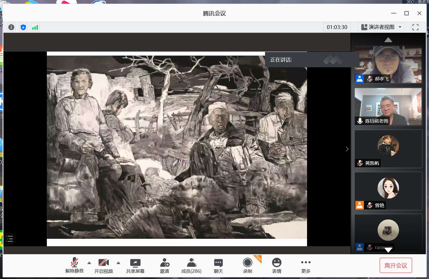 为营造良好的学习氛围,丰富员工专业知识,拓宽学习视野,提升专业素养,中国画系组织“百年传承 长江论坛”中国画·书法教学与创作系列研究——《名师创作教学系列讲座》学术活动。9月18日晚,我系特邀陈钰铭教授为全系师生做了题为《水墨与现实主义创作》的学术讲座。为避免人员聚集,减少交叉感染的概率,本次讲座主要采用腾讯会议的形式。本次讲座由中国画系副主任郝孝飞主持,参加本次讲座的有中国画系师生近三百人。