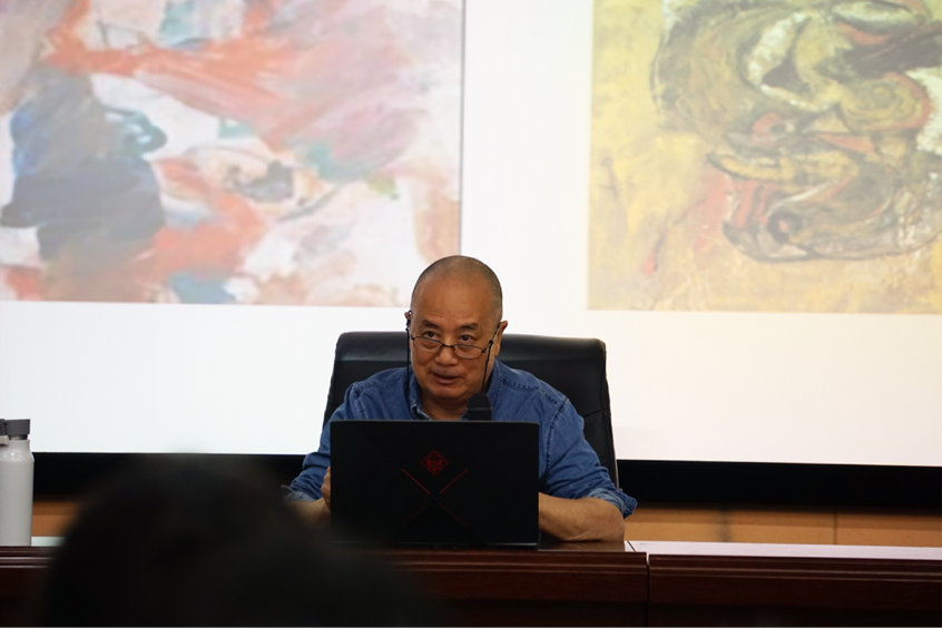 接着,钟孺乾教授为我们分享了他的创作经历与思路。为我们讲解了在革命现实主义背景下的中国画创作的三个特征:内容决定形式、迹象特征、以写生突破旧程式。并分享了他的重彩探索轨迹:敦煌启发、楚美术参照、文人写意传统转化、西方现代艺术重释、工具材料更新。